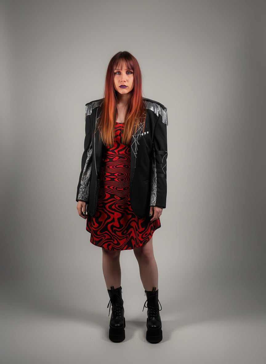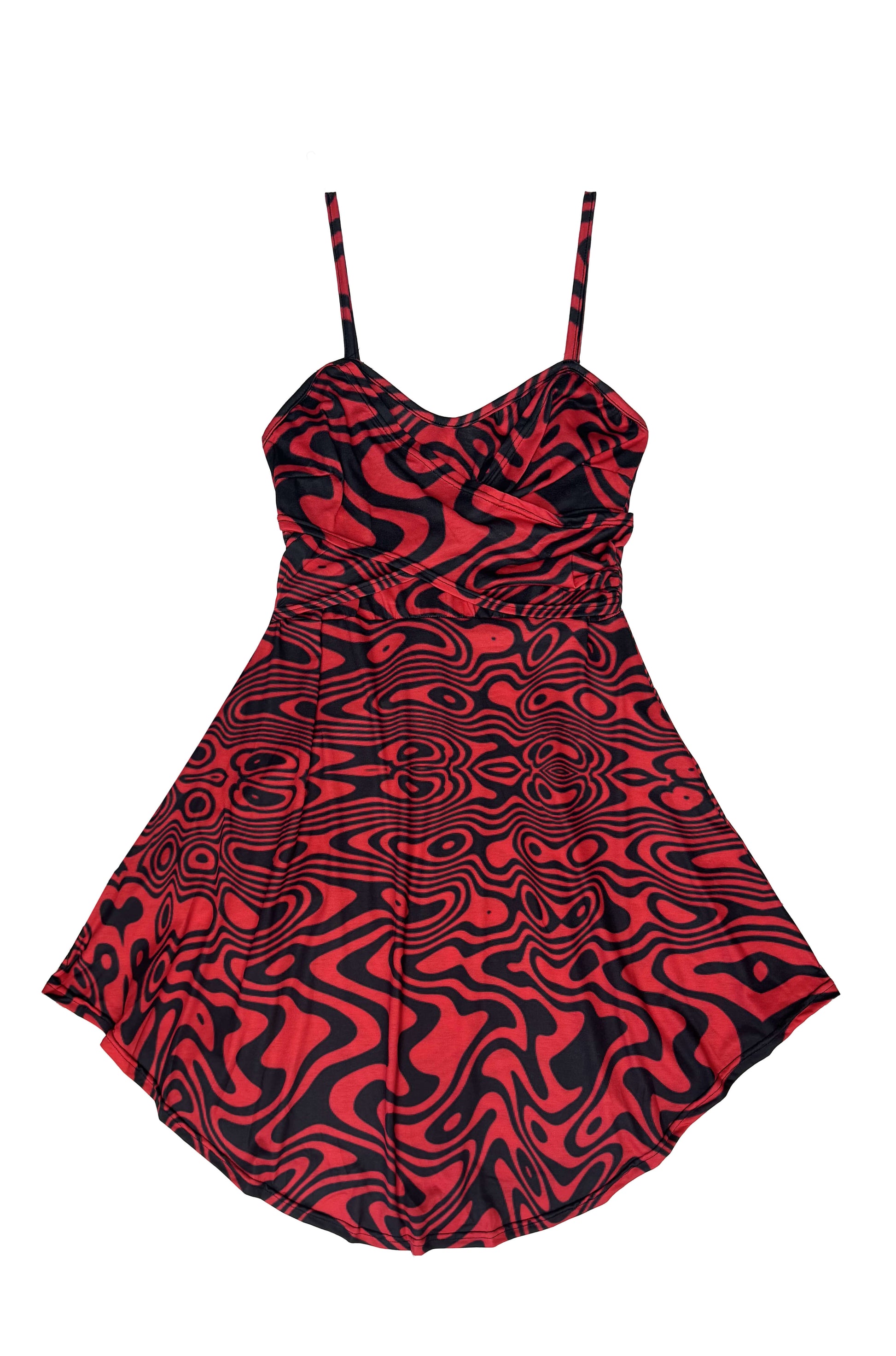 This dress turns up the heat with a faux-wrapped top that layers extra fabric without adding bulk. The cut gives you shape and movement while keeping things easy. The red-and-black distortion print flows across the surface like liquid static, bold enough to stop traffic and sharp enough to hold attention.