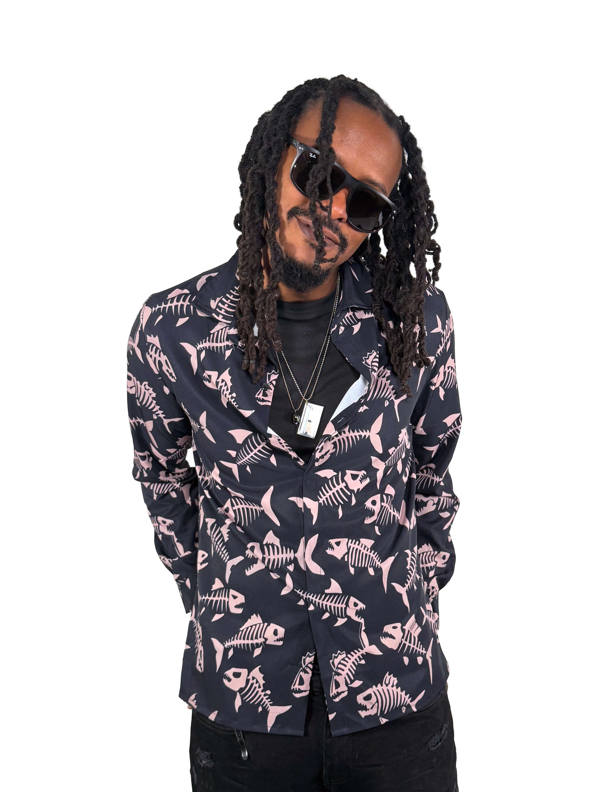 Sharp collar. Clean lines. Covered in a swarm of skeletal fish that swim across black like bones in the dark. Swarm? I meant school. Swarm sounds better. The off-white print keeps it striking without losing edge.