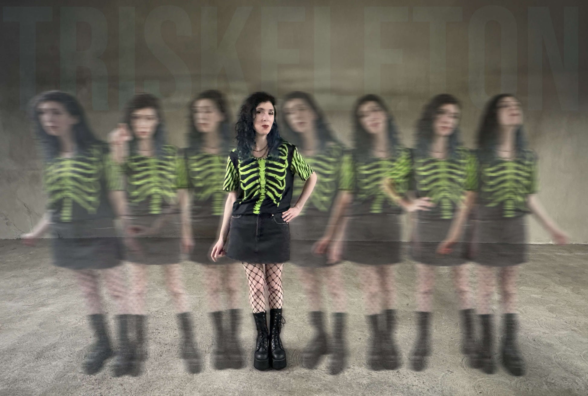 This cute, soft, sexy tee has a wild neon ribcage front print, matching green sleeves in a zebra pattern. Subtle dark green borders the lime print to really make it pop. The Low-cut V is a flattering cut. Layer it up. Wear it solo.